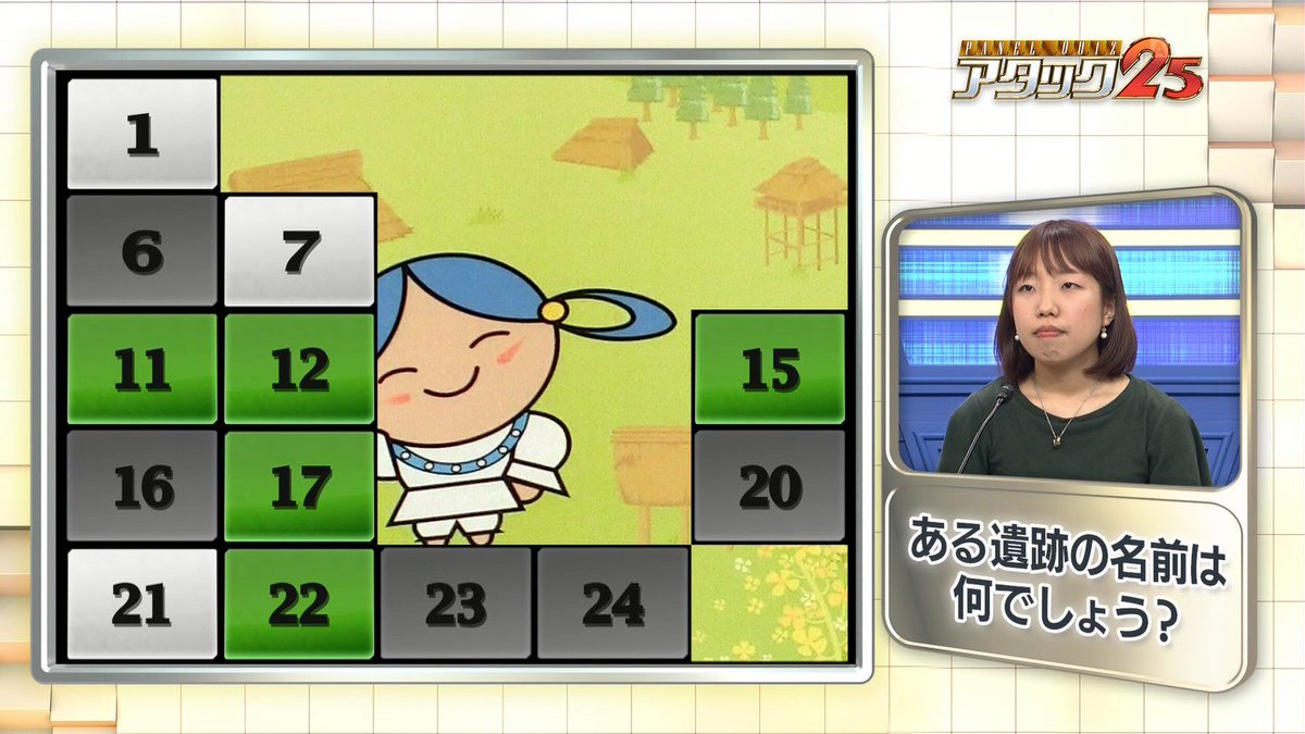 アタック25 最終問題. パネルクイズ アタック25パネルクイズ アタックにじゅうご英語表記panel quiz attack 25は1975年昭和50年4月6日から2021年令和3年9月26日予定まで朝日放送テレビabcテレビ が制作しテレビ朝日 系列で毎週日曜日1325 - 1355 に放送されている視聴者参加型 クイズ番組. もしもアタック25の最終問題の答えが城所龍磨だったら スポーツ アタック25の最終問題優勝者が獲得したパネルの分だけ後ろの映像が見えるやつの正解がホークス. アタック25とわたくし 私の住んでた地方はアタックが放送されてなかったので初めて見たのは1992年に大学に進学してからです最初はあまり見なかったのですがパネルのとり方のおもしろさに気づき93年の夏頃から毎週録画するようになりました 2000年末残念ながら地元に帰ってしまった.