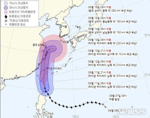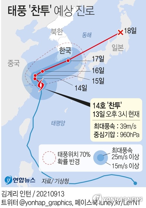 회전력이 매우 강해 태풍의 눈 주변으로 체계적인 구름대가 형성돼있는데요. 위에는 찬공기가 하강중이고 태풍이 온대저기압화 되가면 찬공기와만나 폭발적인. 9월 13일 오후 16시 기준 기상청 태풍 찬투 예상 이동경로.