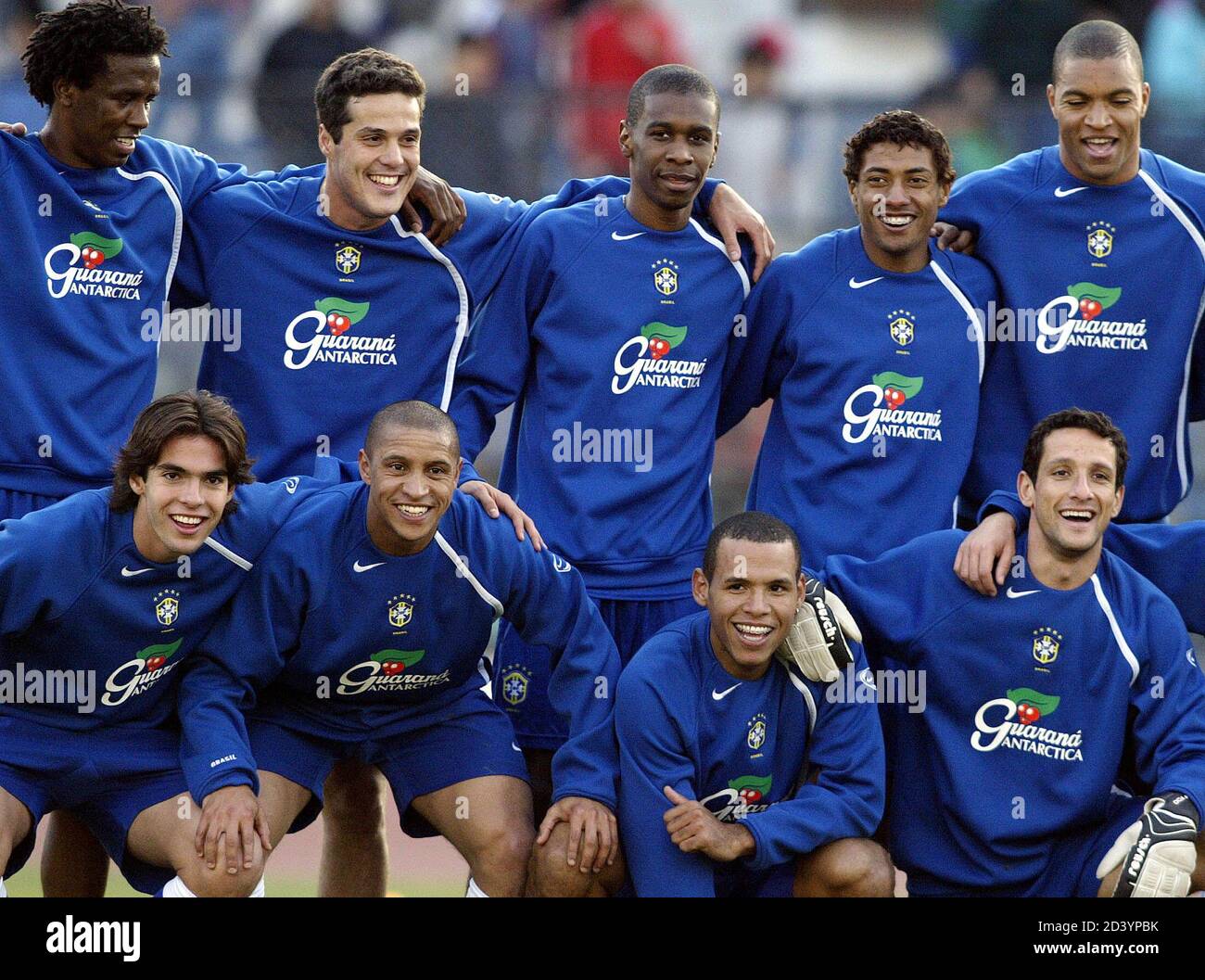 Brazil S Top L R Roque Junior Julio Cesar Juan Kleberson Dida Bottom L R Kaka Roberto Carlos Luiz Fabiano And Beletti Pose For A Picture At The End Of Practice Inside The Nacional Stadium