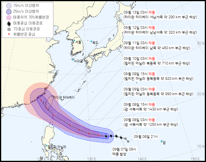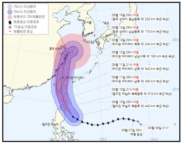 이번 태풍 경로는 일반적인 태풍의 경로와는 조금 다릅니다. 이날 오후 4시 발표된 예상 경로에서 중국 상하이 인근 중국 동해안으로 경로를 북동진할 것으로 보인 태풍 찬투는 이후 좀 더 경로를 북동진으로 꺾어 제주도 남쪽 해상으로. 추석 직전인만큼 부디 다들 탈없이 잘 지나가시면 좋겠습니다.